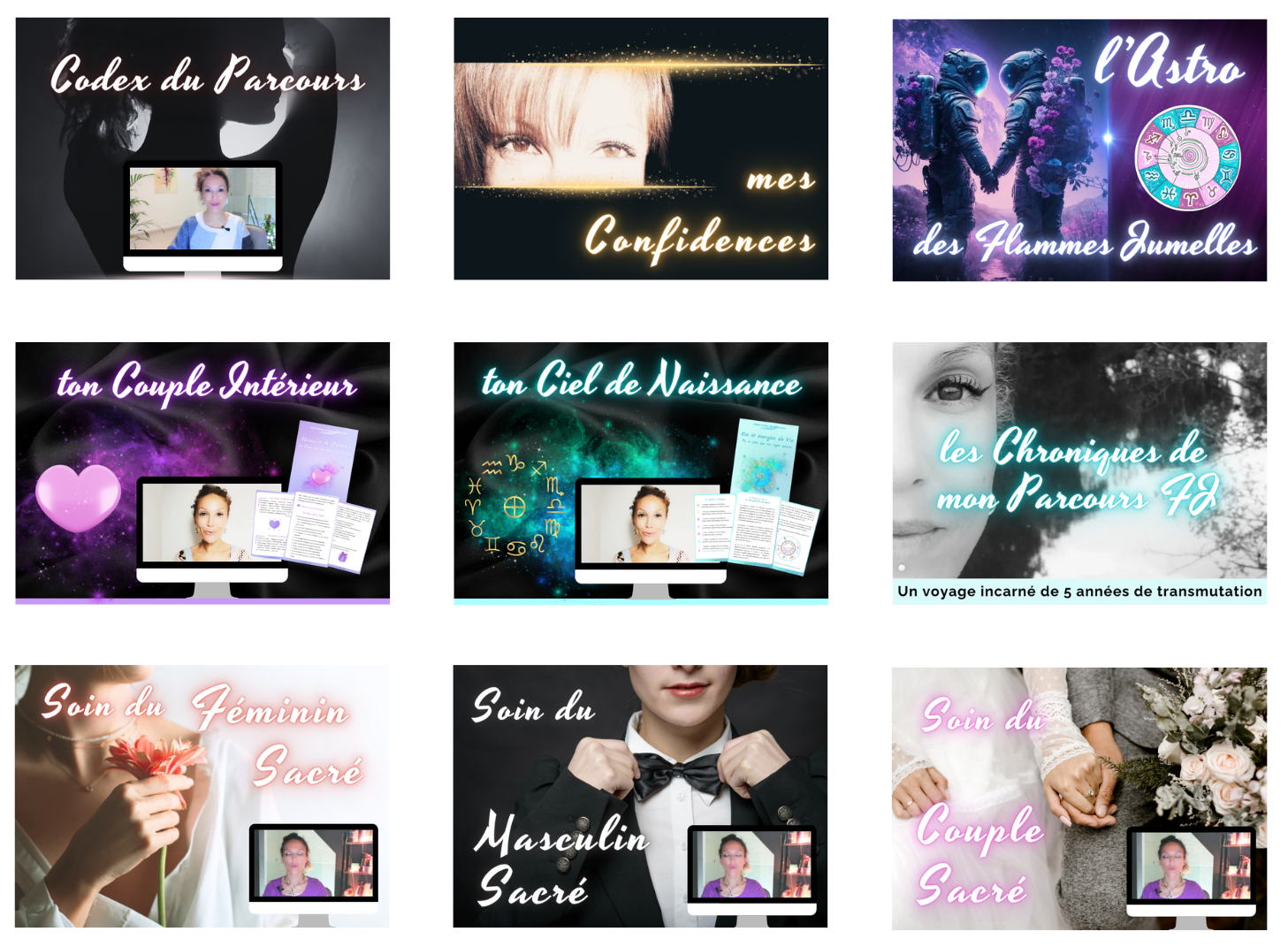 L’effet miroir avec LUI • La guérison du Masculin & Féminin • L’éveil spirituel • Les challenges karmiques • L’énergie sexuelle • Les croyances limitantes • Les peurs archaïques • Le leadership féminin • La dépendance affective • La mission de vie • Les morts symboliques • La manifestation en conscience, et bien d'autres.